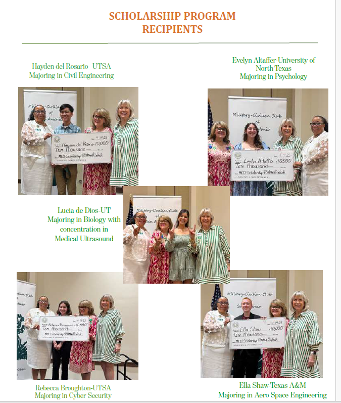 The Military-Civilian Club (MCC) and the Military-Civilian Charitable Foundation (MCCF) have been awarding scholarships to high school seniors since the mid 1970’s. The scholarships are open to children of military personnel in all six Services: Army, Navy, Marine Corps, Coast Guard, Air Force and Space Force who live in the San Antonio area.